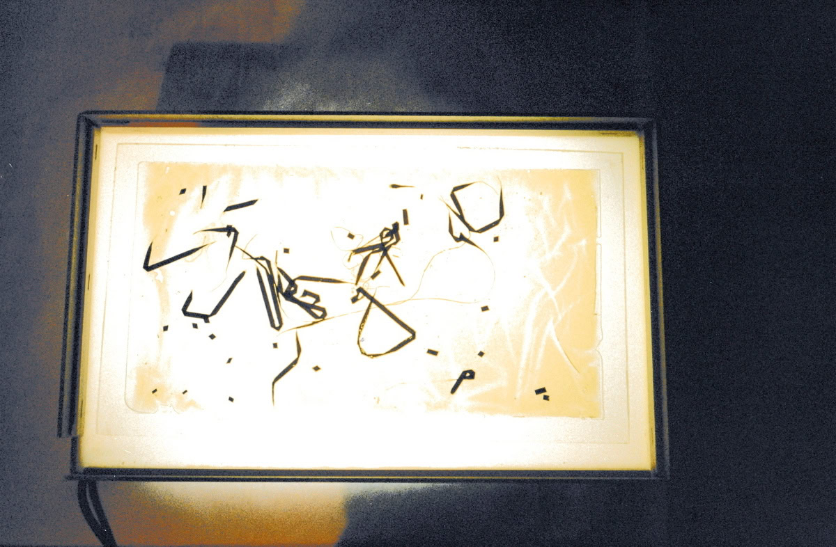 Graphische Notation aus Gefrierbeuteln 15,5 x 30 cm,Götterspeise, in die das Kassettenband mit Aufnahmen der Performance "Ephemera" fixiert ist,